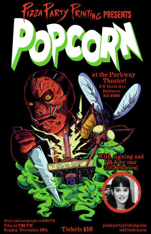 Pizza Party Printing is proud to present the ludicrously fun 1991 slasher POPCORN at the Parkway Theater with special guest, star of the film, Jill Schoelen in attendance!